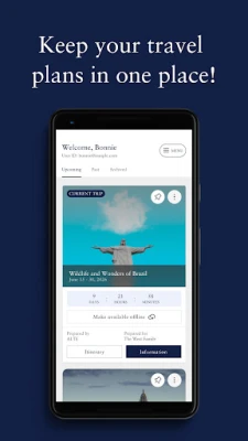 Atklājiet savu unikālo ceļojuma plānu, kas ir precīzi pielāgots jūsu vēlmēm un soli pa solim izklāsta katras dienas aktivitātes un rūpīgi izraudzītās pieredzes. Vairs nekādas kavēšanās vai neziņas! Turklāt ALTE Travel App kalpo kā droša digitālā glabātuve visiem jūsu svarīgākajiem ceļojuma dokumentiem. Piekļūstiet e-biļetēm, viesnīcu rezervāciju apstiprinājumiem un citiem būtiskiem ierakstiem jebkurā brīdī, nodrošinot, ka viss nepieciešamais ir vienmēr pa rokai, sakārtots un viegli atrodams.