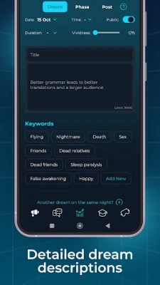 Sāciet aizraujošu ceļojumu savas apziņas labirintos ar LucidMe — lietotni, kas radīta, lai pārveidotu jūsu nakts pieredzi par pašu izpētes un personīgās izaugsmes dārgumiem. LucidMe piedāvā unikālu telpu, kurā varat rūpīgi dokumentēt savus sapņus, sākot no visvienkāršākajiem nakts attēliem līdz pat spilgtākajām lucīdajām vīzijām. Šī personīgā sapņu hronika ļauj jums atspoguļoties, novērtēt savu progresu sapņošanas spēju attīstībā un atklāt slēptās likumsakarības, kas veido jūsu zemapziņas ainavu. Ar LucidMe katrs rīts kļūst par iespēju atgriezties un apzināties to, ko esat piedzīvojis miegā.