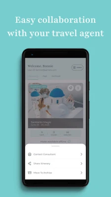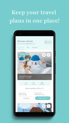 Ar šo lietotni jums ir pieejams detalizēts un rūpīgi izstrādāts ceļojuma plāns, kas katrai dienai piešķir skaidru struktūru, ļaujot jums vienkārši sekot norādēm un baudīt jaunas atklāsmes. Vairs nekādas ilgstošas meklēšanas e-pasta iesūtnē! Visi svarīgākie ceļojuma dokumenti – sākot no lidojumu biļetēm un viesnīcu rezervācijām līdz pat apdrošināšanas polisēm un transporta kartēm – ir ērti apkopoti vienuviet. Tas nodrošina tūlītēju piekļuvi visai nepieciešamajai informācijai, padarot jūsu ceļojuma loģistiku vienkāršu un pārskatāmu.
